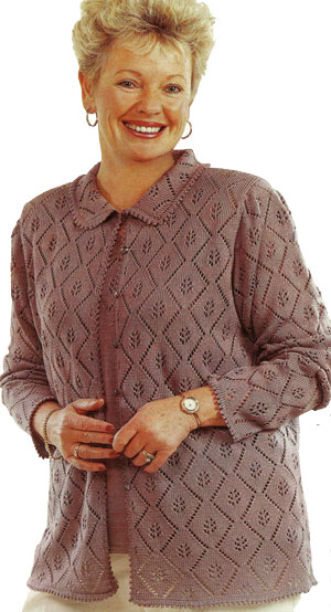 Take a plain lace stitch pattern and knit it into a button-front A-line cardigan, with round neck and long, set-in sleeves. Add a Peter Pan collar and edge it all with a ribber picot trim.