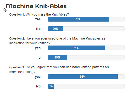We received a lot of excellent feedback on the machine Knit-Ables and we've been encouraged to "keep 'em coming".The feedback we received was helpful and thoughful... look for more inspiration soon.